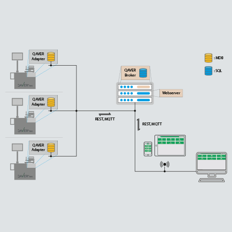 Mit dem Server-Client Programm können viele QAVER an unterschiedlichen Standorten in einem bestehenden Firmennetzwerk integriert werden. Produkte und Messergebnisse können somit ortsunabhängig und zentral verwaltet und bearbeitet werden.